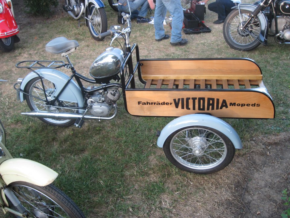 Das ist niedlich (und selten!): Victoria Tory–Moped als Lastendreirad nach Vorbild italienischer Fahrzeuge. Beachtlich die solide Ausführung mit drei Bremsen und die Vorderrad–Aufhängungen.