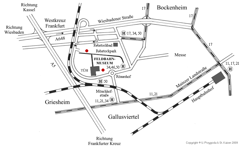 Die Karte zeigt, wie ihr das Frankfurter Feldbahnmuseum am besten erreicht. Der linke, obere Punkt markiert den Veranstaltungsort des Oldtimer–Fahrtags (Einfahrt über Max Pruss-Straße, beschildert). Besucher dieser Veranstaltung können auch ab dem Museum selbst (unterer Punkt) mit dem Zug dorthin fahren.